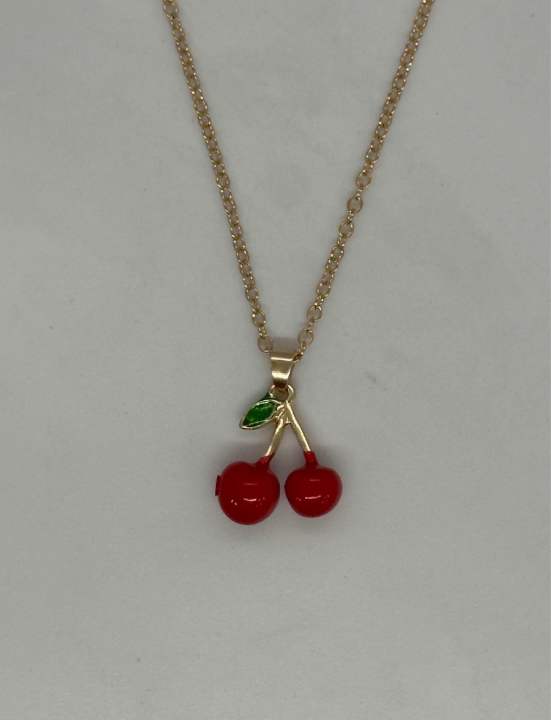 Fashion necklace featuring a red enamel double-cherry pendant on a gold-toned alloy chain