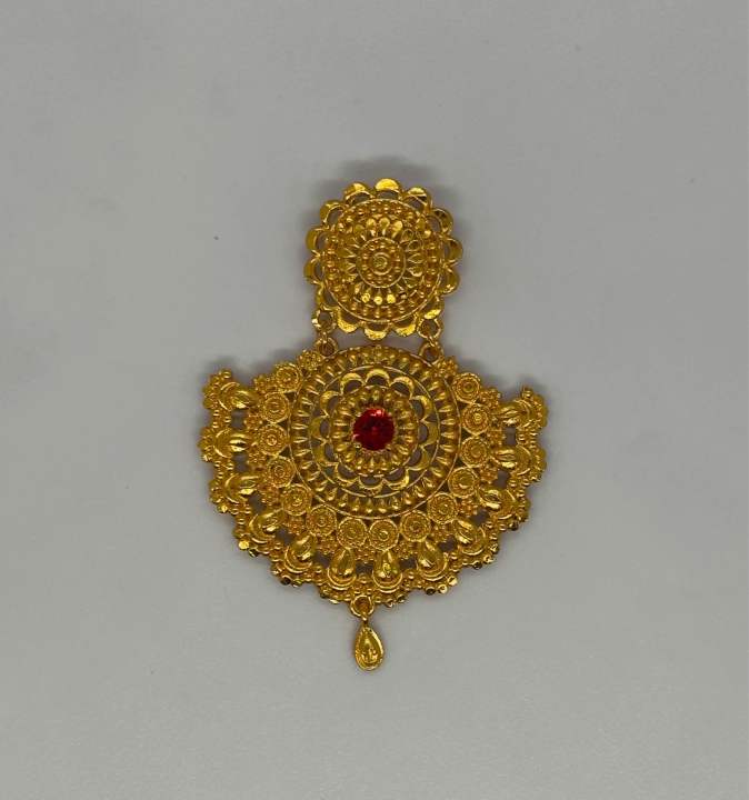 Gold-plated, intricately carved traditional-style mangalsutra pendant with a red stone center
